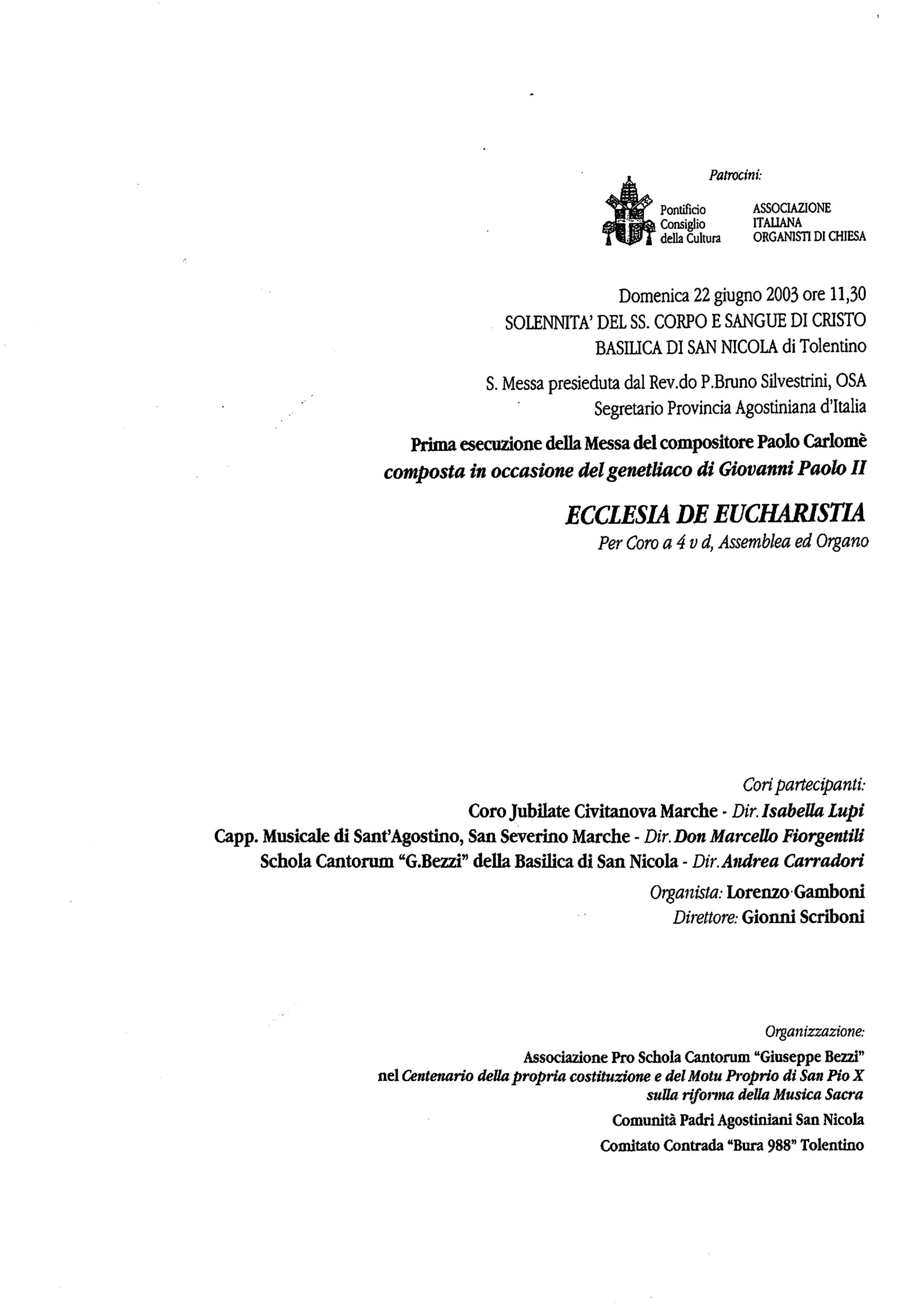 Given my versatility with the classical styles, I was commissioned to compose liturgical music for the “G. Bezzi” chorus of St Nicholas Basilica in Tolentino (Macerata, Italy). The mass “Ecclesia de Eucharistia” in 2003, composed by me for mixed choir and organ, was to celebrate Pope John Paul II’s birthday. Still in 2003 the canticle “Inno dei Salvati” for mixed choir and organ, based on a text from the Apocalypse, was composed by me for the occasion of the “Vespri solenni” of St Nicholas from Tolentino (see above).